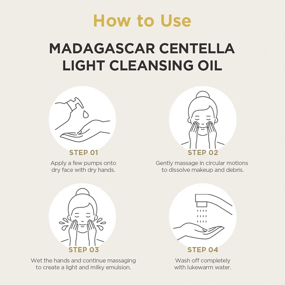 This light clensing oil helps to remove makeup residue and purify skin. Infused with MCT Oil derived from coconut to create a oil-type Centella Asiatica Extract. Contains various Botanical Oils to prevent skin irritation. Delivers great cleansing effects to remove makeup and deeply cleanses clogged pores for a clearer skin.