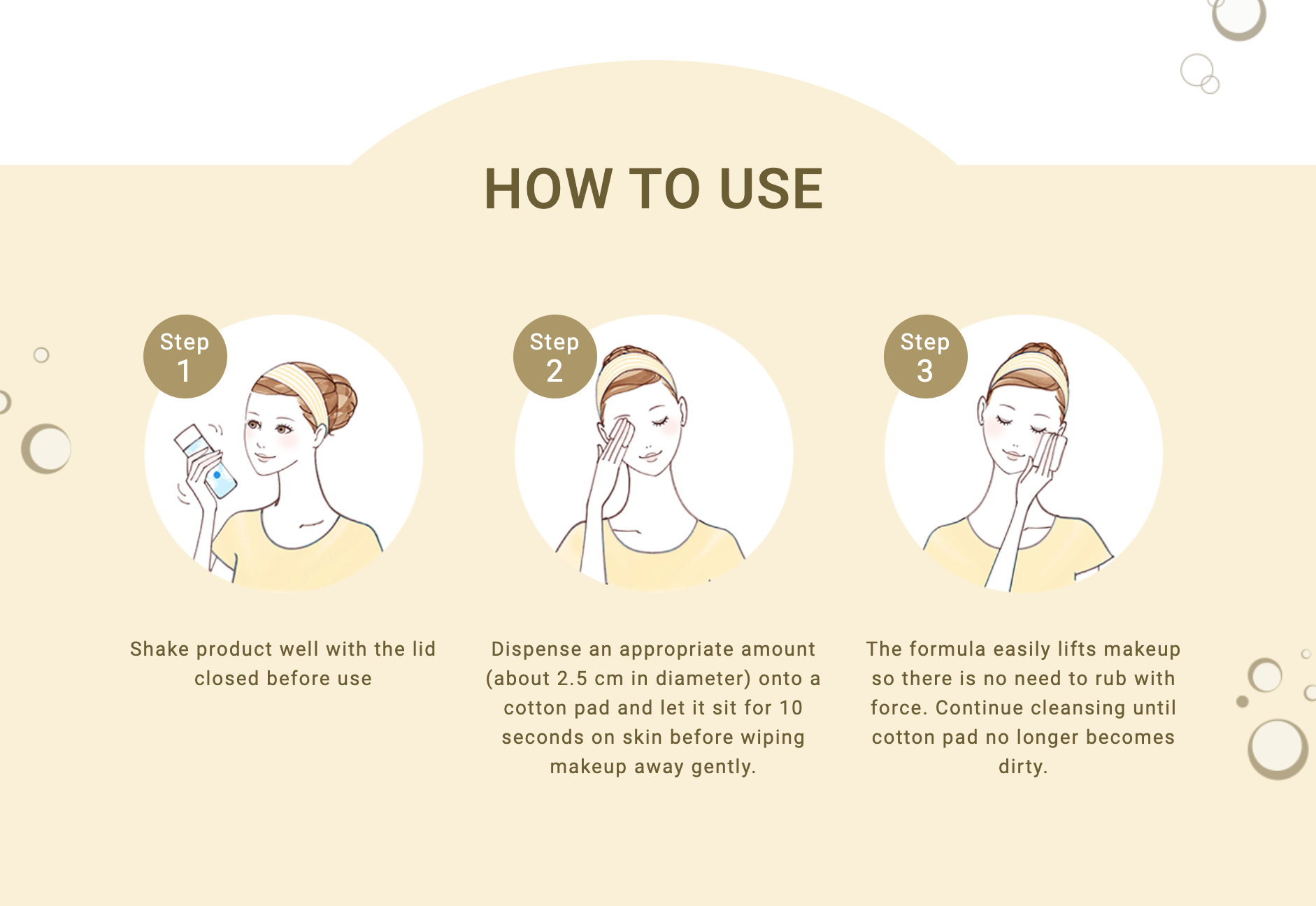 Dispense an appropriate amount (about 2.5 cm in diameter) onto a cotton pad and let it sit for 10 seconds on skin before wiping makeup away gently.