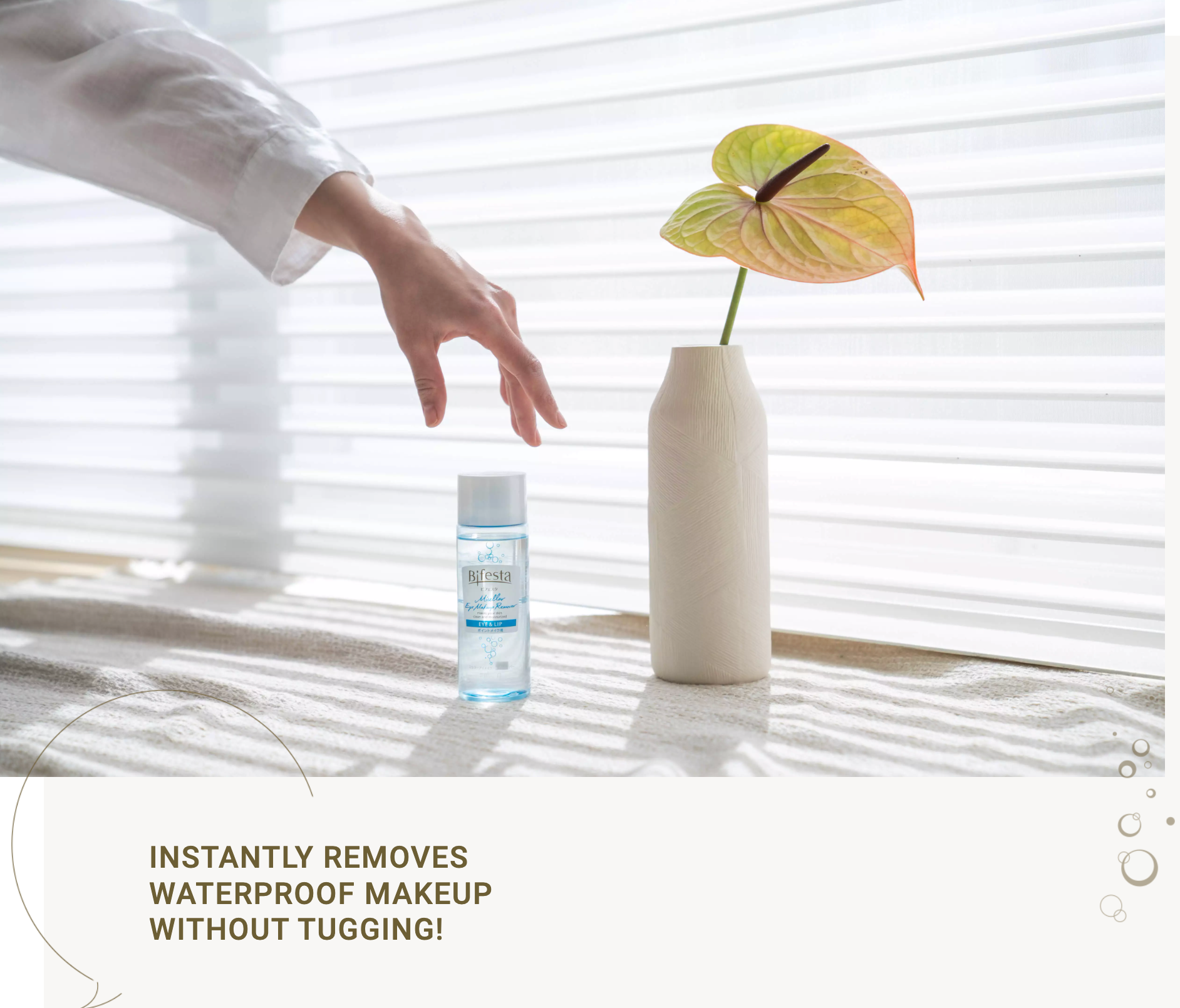 Bifesta Micellar Eye Makeup Remover eliminates even the most stubborn waterproof mascara, eyeliner, and lip colors swiftly.