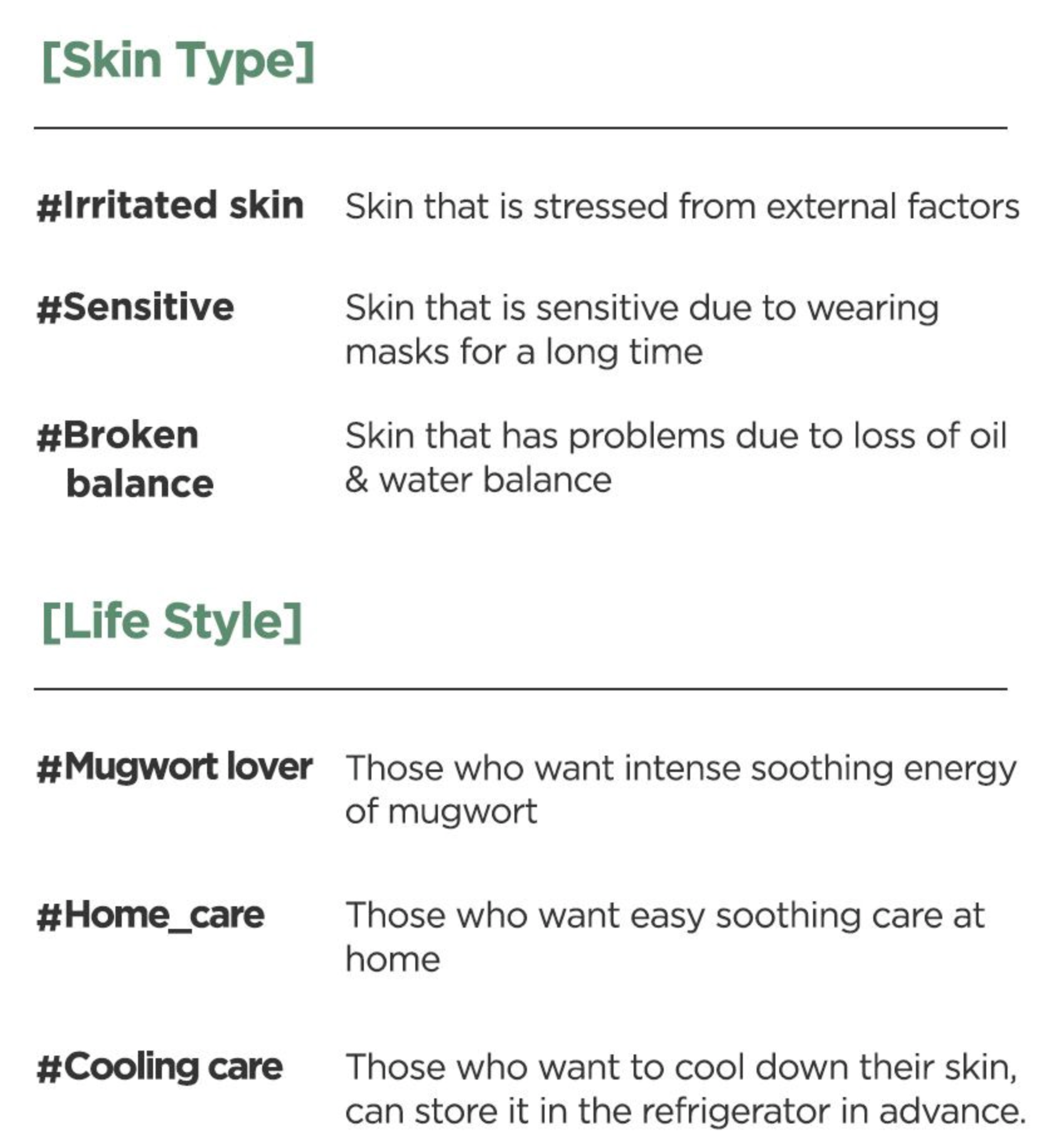- Artemisia / Mugwort / Mugwort has an antibacterial, anti-inflammatory and soothing effect on the skin.