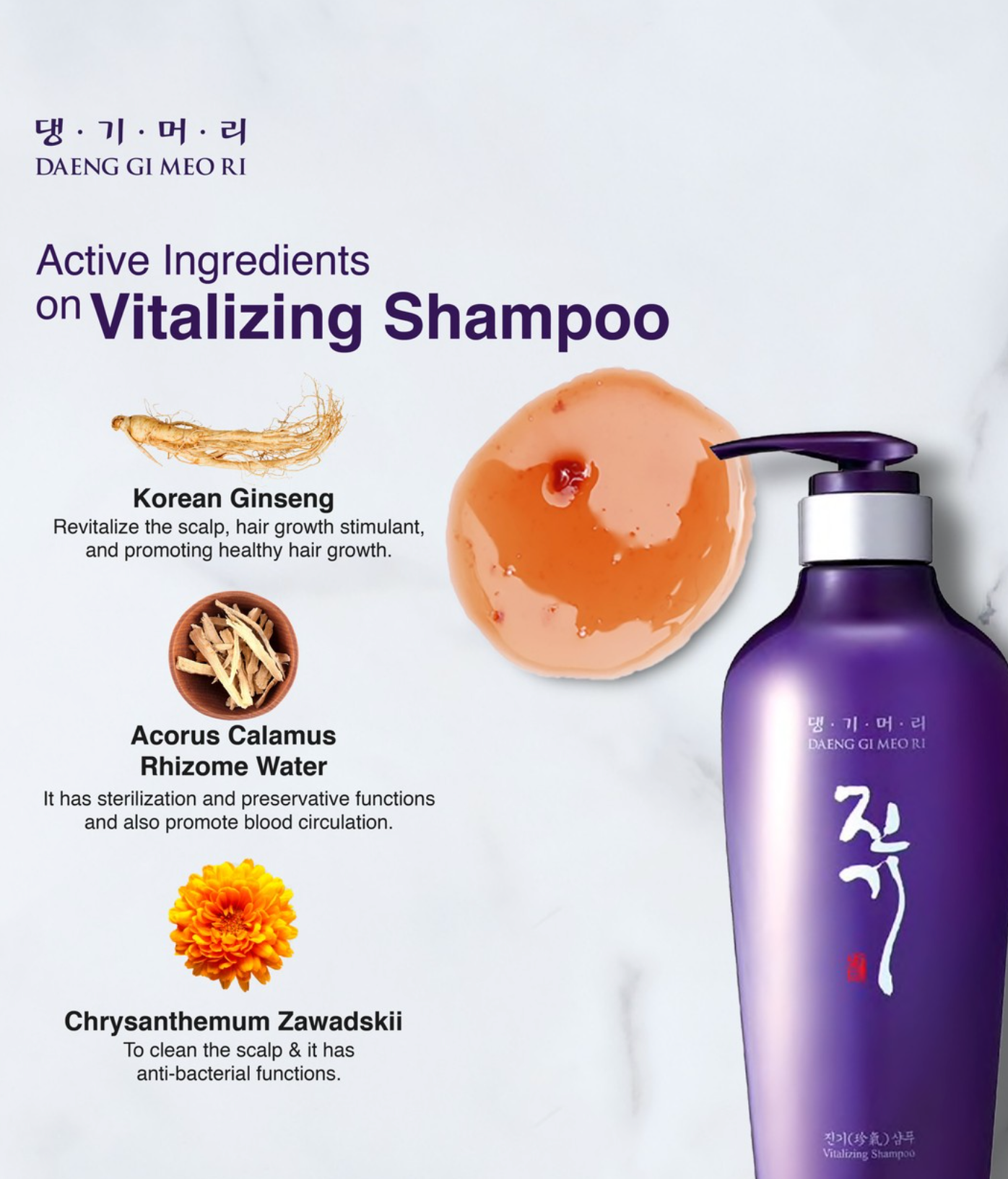 Aqua, Chrysanthemum Boreale Flower/Leaf /Stem Extract, Sodium Laureth Sulfate, Sodium Lauryl Sulfate Rehmannia Glutinosa Root Extract, Thuja Orientalis- Leaf Extract, Artemisia Vulgaris Extract, Cocamidopropyl Betaine, Dimethicone, Gleditsia Japonica Fruit Extract, Morus Alba Bark Extract, Eclipta Prostrata Extract, PEG-7 Glyceryl Cocoate, Acorus Calamus Rhizome Water, Parfum, Cnidium Officinale Root Extract, Cocamide MEA Decylene Glycol, Sodium Chloride, Carbomer, Sodium Cocoyl Alaninate, Triethanolamine, PEG-10, Guar Hydroxy propyltrimonium Chloride, Propylene Glycol, Menthol, Hydroxyacetophenone, Lactobacillus/Centella Asiatica/ Gleditsia Sinensis Thorn/Houttuynia Cordata Extract/ Phellodendron Amurense Bark/Polygonum Cuspidatum Root/Prunella Vulgaris/Torilis Japonica Extract Ferment Filtrate, Panax Ginseng Root Extract, Disodium EDTA, Panthenol, Butylene Glycol, Citric Acid, Lauramine Oxide, Oak Vinegar, Hydrolyzed Keratin, Portulaca Oleracea Extract 1,2-Hexanediol, Sodium Benzoate, Phenoxyethanol Linalool, Alpha-Isomethyl Ionone, Limonene, Hexyl Cinnamal, Citronellol